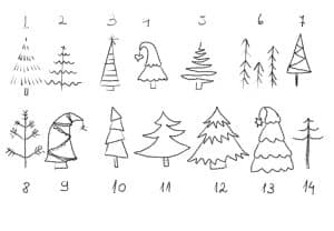 Și atunci când desenați brazi, vă puteți juca cu diferite modele. La fel, puteți adăuga elemente personale. Nu vă fie teamă să fiți inventivi (ideal, mai întâi pe o ciornă, ca să vedeți dacă chiar vă place).