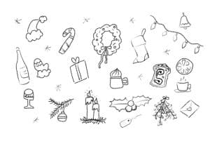 4. La final punem elemente de umplutură: fulgi, clopoței, lumânări, crengi de brad, cutii de cadouri, scrisori, cozonac, vâsc, căni aburinde, felii de portocale, pahare cu vin, beculețe de Crăciun etc.